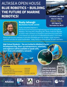 Solutions to global challenges such as energy supply and climate change will be found in the ocean and our need to comprehend it has never been greater. However, experts say only five percent of the ocean has been adequately studied. The Blue Tech Cluster at AltaSea will help advance solutions to a wide range of ocean challenges where experts utilize underwater robotic technology for remote monitoring, sensing and ocean exploration. Remotely operated vehicles (ROVs) and autonomously operated vehicles (AOVs) will be developed, built, tested and launched at AltaSea. The impact of these technological advances will be extended even further through unique STEM education programs and internships for students, the commercialization of scientific breakthroughs and advisement to policymakers on relevant issue areas.