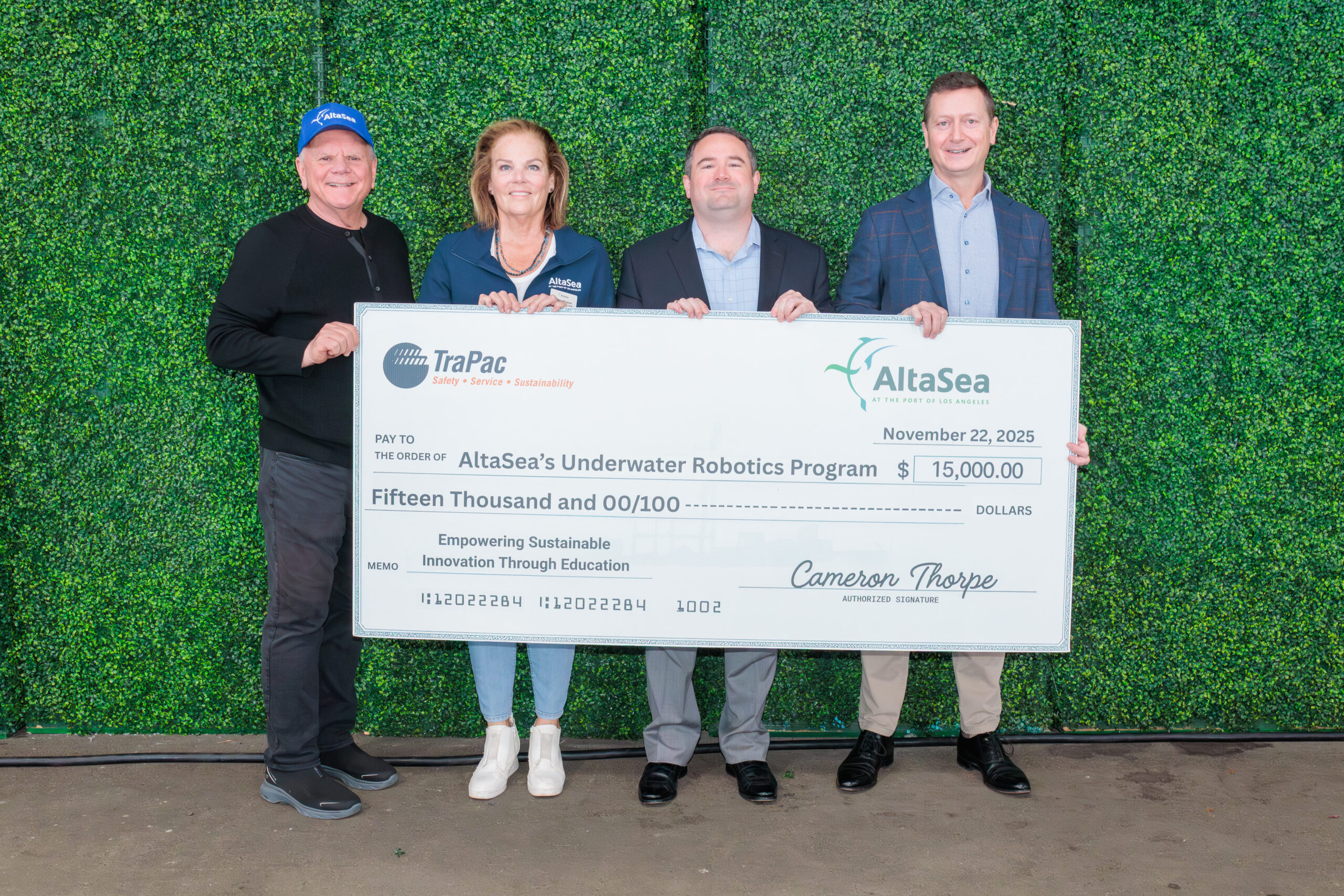 TraPac presented a $15,000 contribution to support student underwater robotics programs. These programs, funded through AltaSea, bring hands-on robotics curriculum into local schools and spark early interest in marine science and technology.