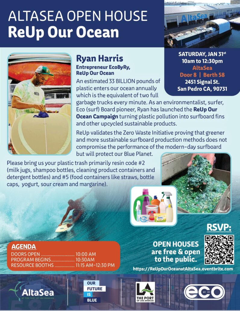 Join us for AltaSea’s first Open House of 2026, centered on the power of recycling and ocean stewardship through the ReUp Campaign. This special edition will feature Ryan Harris, surfboard shaper and sustainability innovator, who is transforming trash collected from the ocean into functional surfboard fins for boards he upcycles.
