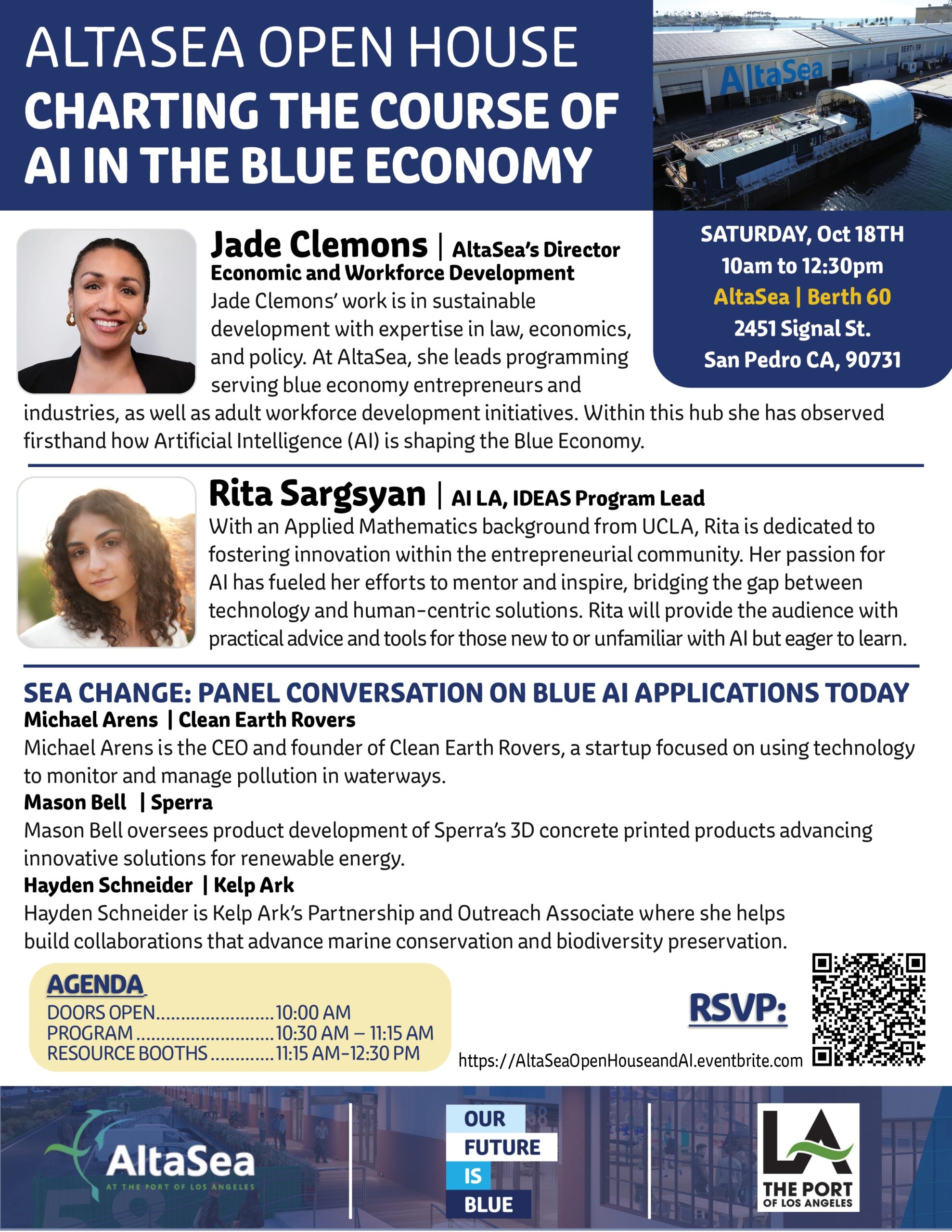 Join us for an exciting morning at the intersection of ocean innovation and artificial intelligence. “Charting the Course of AI in the Blue Economy” brings together pioneering entrepreneurs, AI experts, and sustainability advocates to explore how emerging technologies are transforming our relationship with the ocean. With speakers from Clean Earth Rovers, Kelp Ark, and Sperra, this open house is your chance to dive into real-world applications of AI that are shaping the future of the blue economy.