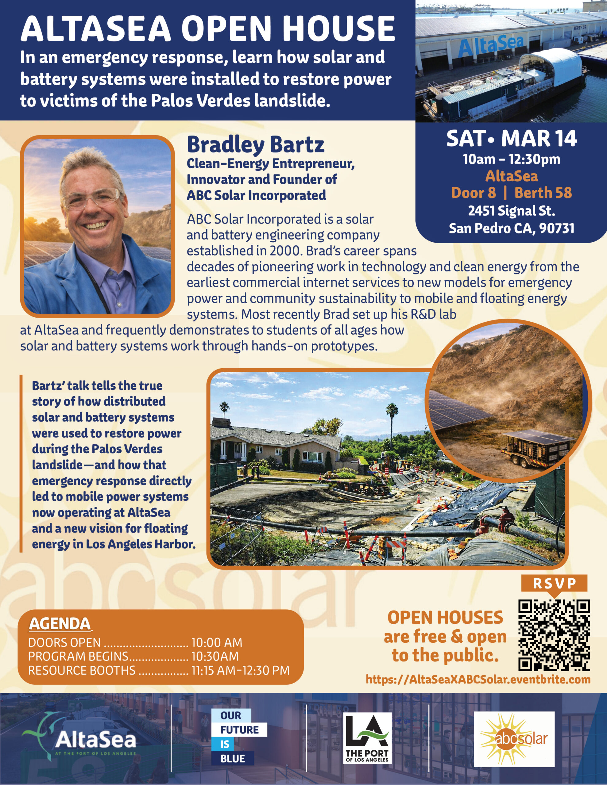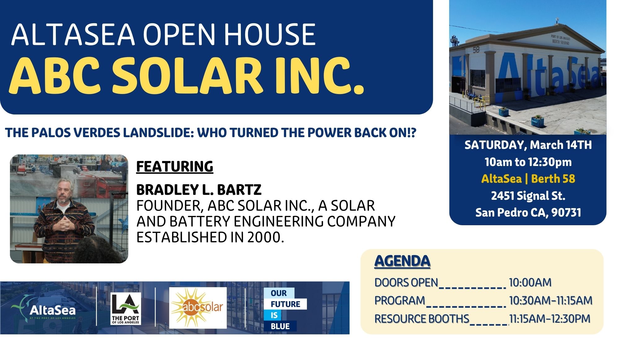Join us for another AltaSea Open House, centered on solar power. This special edition will feature Bradley Bartz, of ABC Solar Inc.
